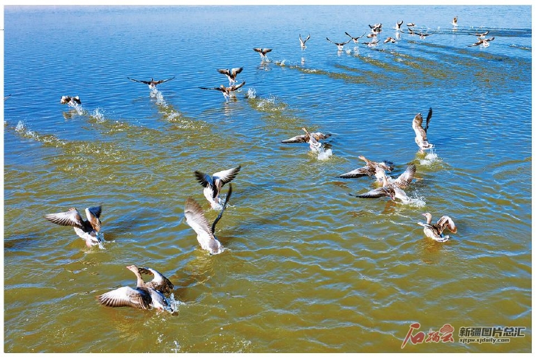 成群水鸟在吉木萨尔县北庭镇黄水槽子水库觅食(10月22日摄)。近年来,该县加大对北庭国家湿地公园保护力度,生态环境不断改善,吸引了越来越多的水鸟来这里繁衍生息。□何龙摄
