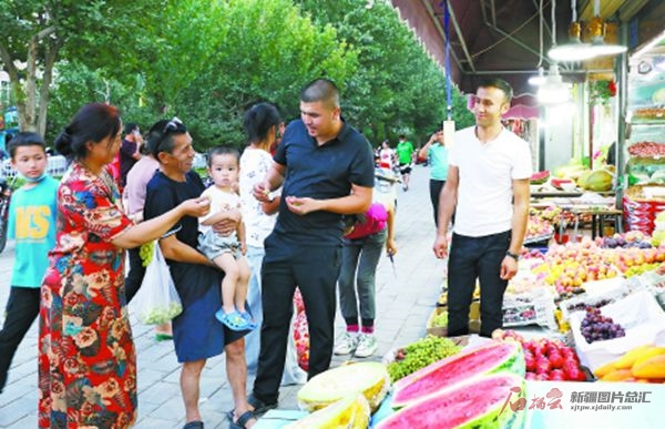 7月14日,市民在阿克苏市王三街休闲消夏,购买水果。 □杨硕摄