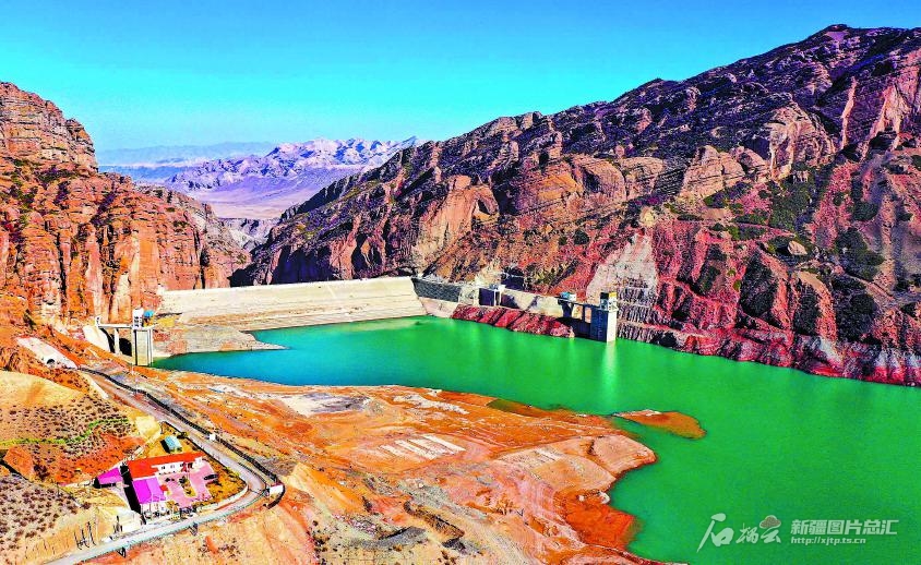 俯瞰呼图壁县石门水库(10月22日无人机摄)。眼下,华电呼图壁能源有限公司所管辖的石门水库正值蓄水期,为提升灌溉和发电能力,电站及时组织人力,加强水库巡查,确保生产安全。 □陶维明摄