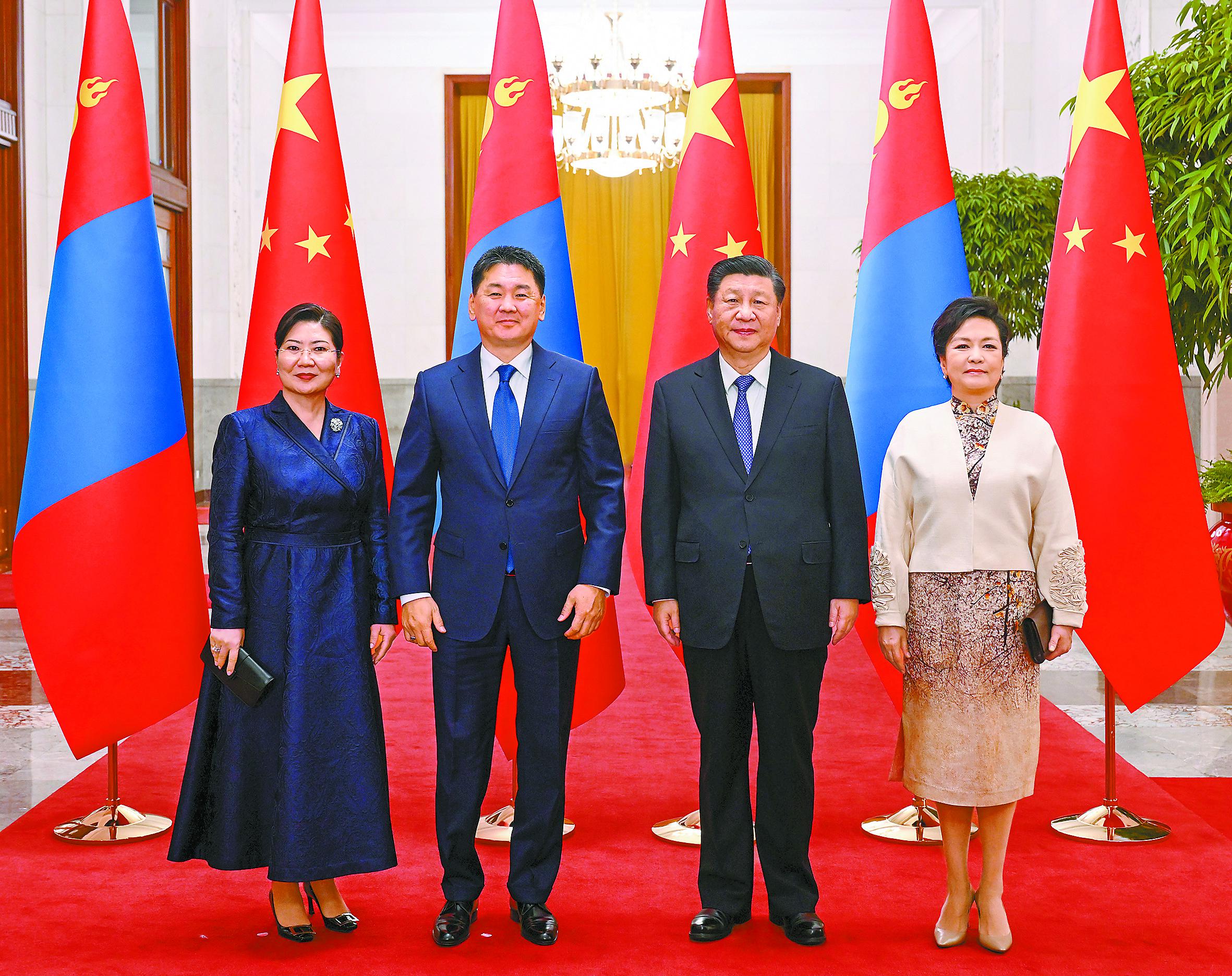 11月28日,国家主席习近平在北京人民大会堂同来华进行国事访问的蒙古国总统呼日勒苏赫举行会谈。会谈前,习近平在人民大会堂北大厅为呼日勒苏赫举行欢迎仪式。这是习近平和夫人彭丽媛同呼日勒苏赫和夫人宝勒尔策策格合影。 □新华社记者张领摄