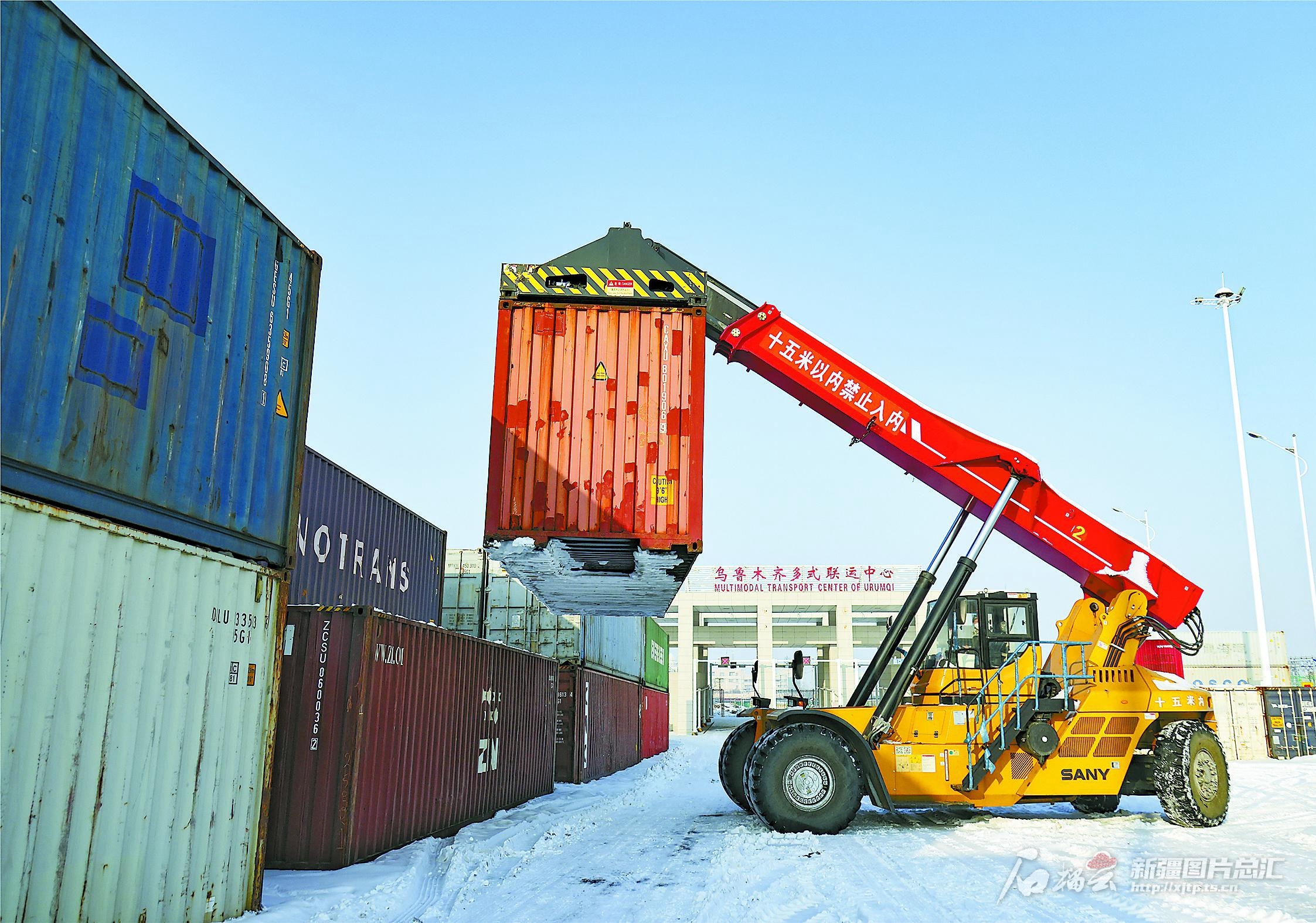 1月28日,工作人员在乌鲁木齐多式联运中心驾驶起重机装载集装箱。乌鲁木齐国际陆港区进一步优化物流组织服务,充分发挥中欧班列(乌鲁木齐)集结中心示范工程作用,推动多式联运中心高质量发展。 □石榴云/新疆日报记者谢龙摄