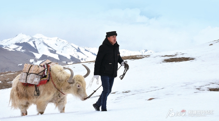 居马汗·多来提牵着牦牛,行走在海拔4000多米的帕米尔高原冰达坂上。 □本人供图