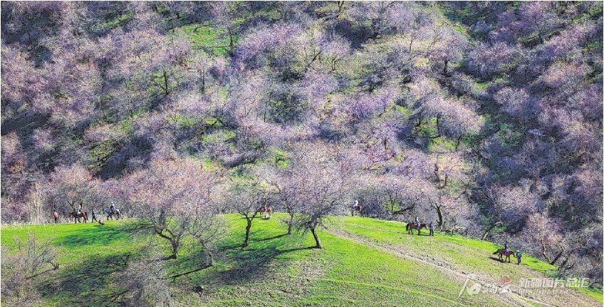 4月5日,游客在新源县那拉提杏花谷深处骑马游玩。清明之际,那拉提杏花谷草木萌发,3万余亩杏花含苞待放,构成一幅别样春色图,吸引八方游客纷至沓来。□张文庭摄