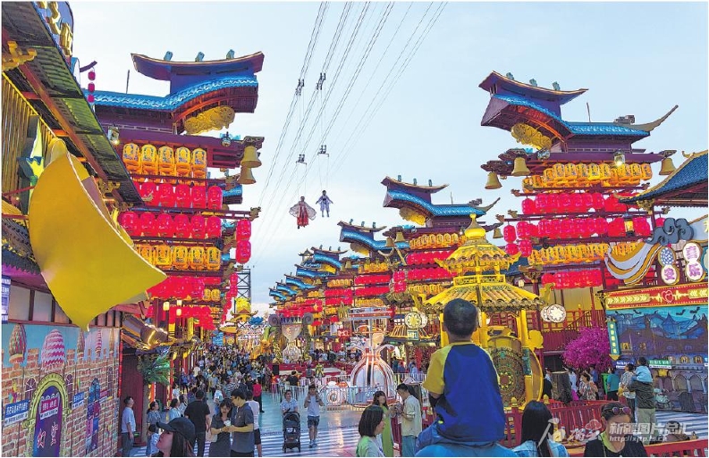 6月2日晚,游客在位于乌鲁木齐市水磨沟区的天山明月城游玩。随着旅游旺季到来,天山明月城游人如织,人们纷纷来此品美食、看表演,乐享夏日好时光。□孙振嵩摄