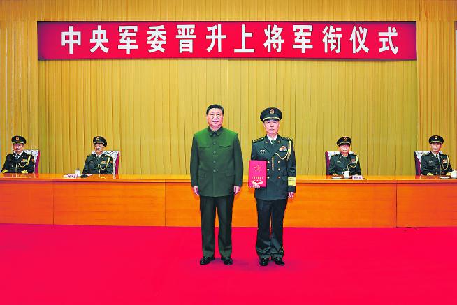 12月23日,中央军委晋升上将军衔仪式在北京八一大楼举行。中央军委主席习近平向晋升上将军衔的陆军政治委员陈辉颁发命令状。 □新华社记者李刚摄