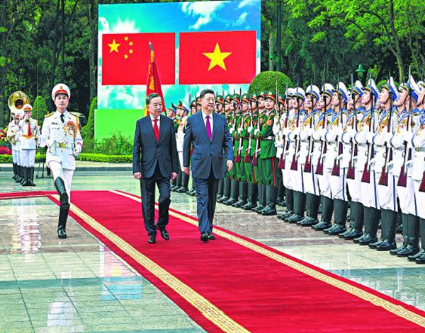 4月14日,中共中央总书记、国家主席习近平抵达河内对越南进行国事访问。当日下午,越共中央总书记苏林为习近平举行隆重欢迎仪式。这是习近平在苏林陪同下检阅仪仗队。 □新华社记者李学仁摄