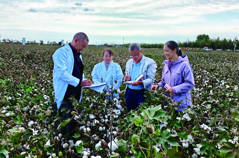 新疆农业职业技术大学教授陈志(左一)、齐士发(右二)等在昌吉国家农业高新技术产业示范区榆泉现代农业产业示范区进行棉花测产(2024年9月16日摄)。□图片由新疆农业职业技术大学提供