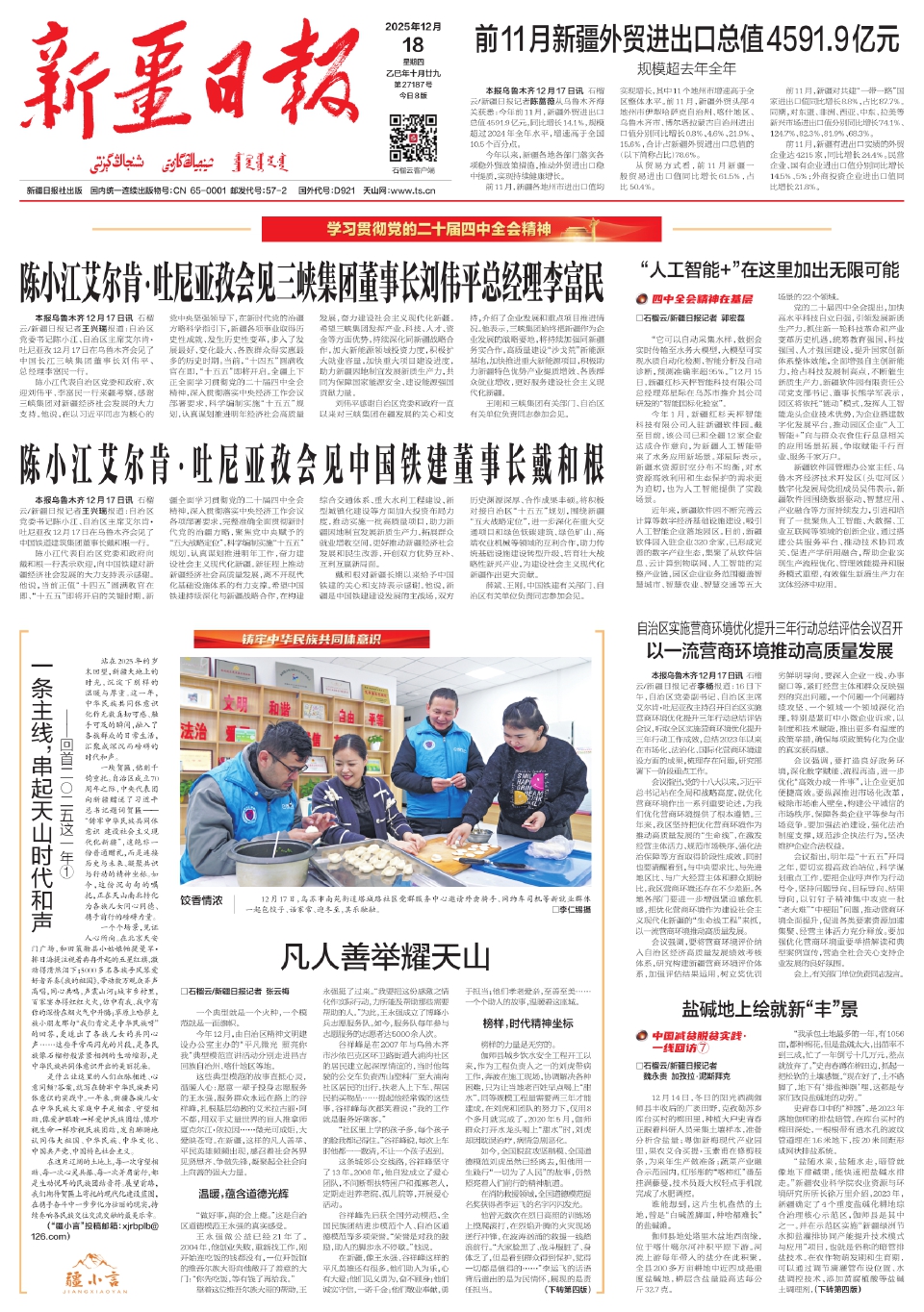 陈小江代表自治区党委和政府,欢迎刘伟平、李富民一行来疆考察,感谢三峡集团对新疆经济社会发展的大力支持。他说,在以习近平同志为核心的党中央坚强领导下,在新时代党的治疆方略科学指引下,新疆各项事业取得历史性成就、发生历史性变革,步入了发展最好、变化最大、各族群众得实惠最多的历史时期。当前,“十四五”圆满收官在即,“十五五”即将开启。全疆上下正全面学习贯彻党的二十届四中全会精神,深入贯彻落实中央经济工作会议部署要求,科学编制实施“十五五”规划,认真谋划推进明年经济社会高质量发展,奋力建设社会主义现代化新疆。希望三峡集团发挥产业、科技、人才、资金等方面优势,持续深化同新疆战略合作,加大新能源领域投资力度,积极扩大就业容量,加快重大项目建设进度,助力新疆因地制宜发展新质生产力,共同为保障国家能源安全、建设能源强国贡献力量。