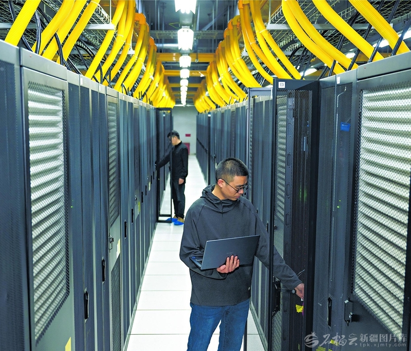 12月24日,位于昌吉市的新疆国际融合算力中心,工作人员在IDC(互联网数据中心)机房巡检。今年5月,新疆首个国际融合算力中心在昌吉市投运,截至目前,其峰值算力已突破2000P。 □何龙摄