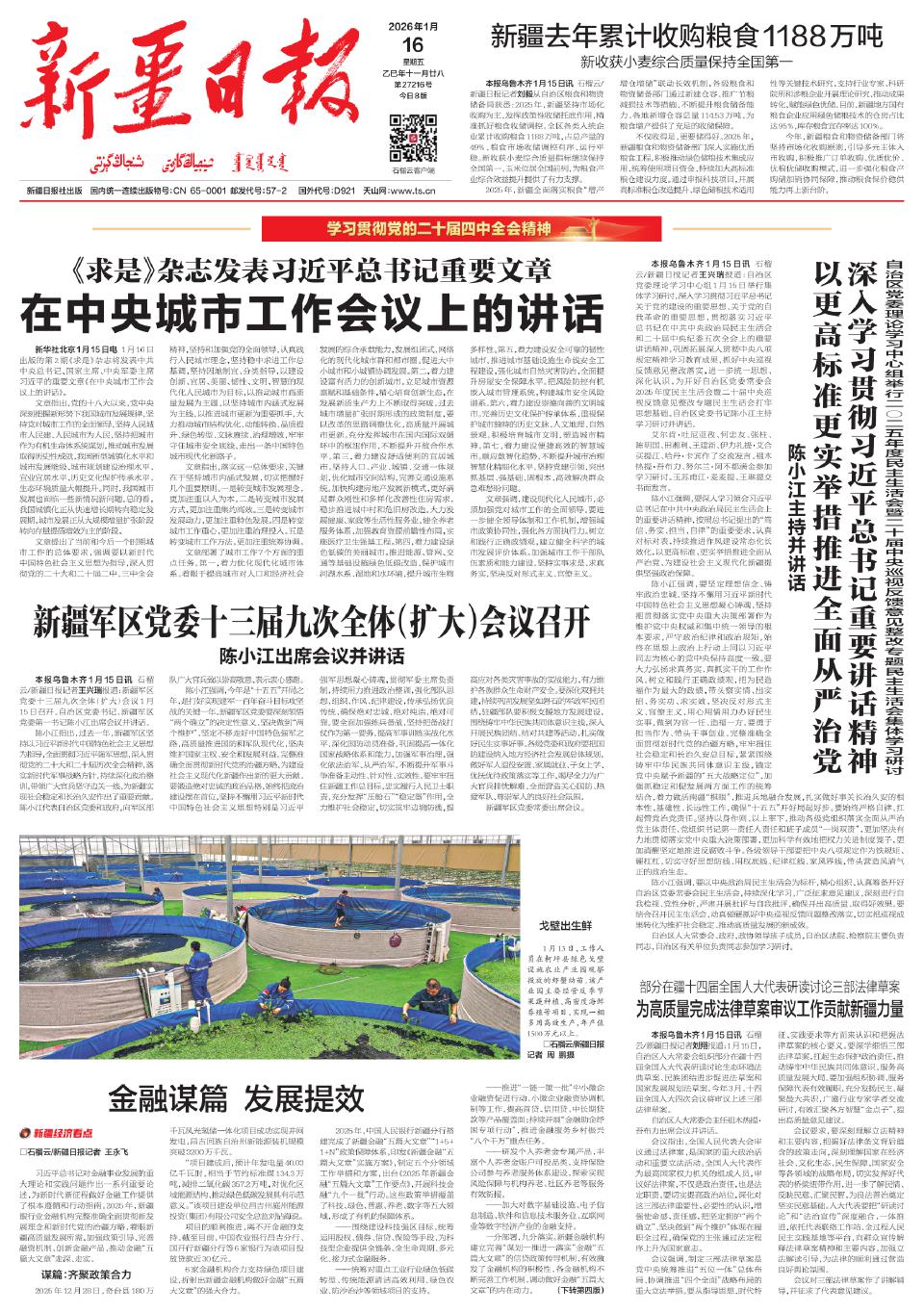 在中央城市工作会议上的讲话 深入学习贯彻习近平总书记重要讲话精神<br>以更高标准更实举措推进全面从严治党 新疆军区党委十三届九次全体(扩大)会议召开 新疆去年累计收购粮食1188万吨 戈壁出生鲜 金融谋篇 发展提效 为高质量完成法律草案审议工作贡献新疆力量