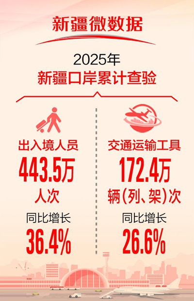 本报乌鲁木齐1月16日讯 石榴云/新疆日报记者王娜从自治区人民政府新闻办公室举行的“提高通关通行服务水平 优化口岸边境营商环境”新闻发布会上获悉:2025年,新疆口岸呈现“大进大出”繁荣景象,累计查验出入境人员443.5万人次、交通运输工具172.4万辆(列、架)次,均创历史新高,同比分别增长36.4%、26.6%。其中,出入境列车4.3万列次,通关量和增长量居全国榜首,中欧(亚)班列占全国一半以上。