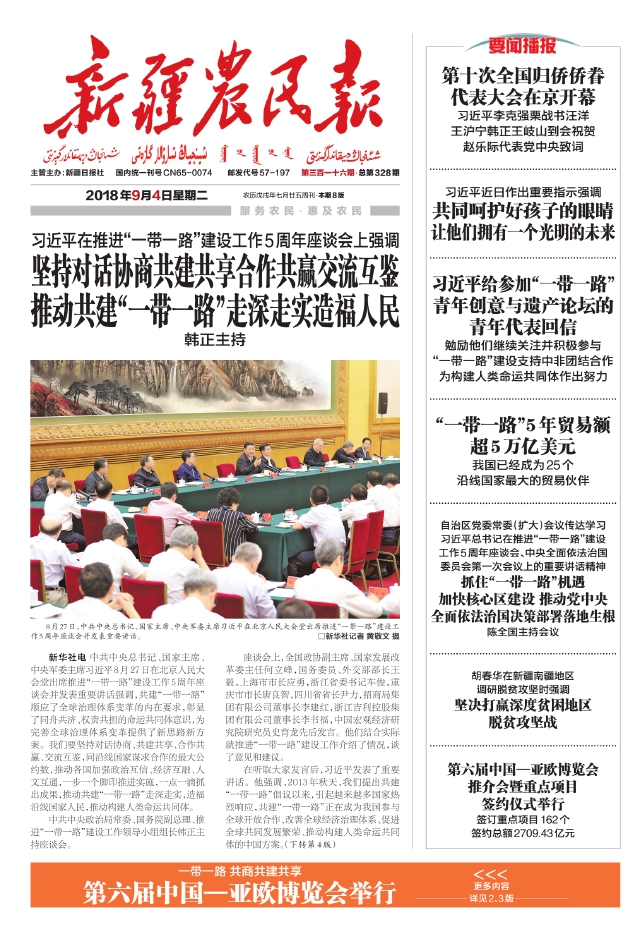 第十次全国归侨侨眷代表大会在京开幕|共同呵护好孩子的眼睛让他们拥有一个光明的未来|习近平给参加“一带一路” 青年创意与遗产论坛的青年代表回信|“一带一路”5年贸易额超5万亿美元|抓住“一带一路”机遇加快核心区建设推动党中央全面依法治国决策部署落地生根|坚决打赢深度贫困地区脱贫攻坚战|第六届中国—亚欧博览会推介会暨重点项目签约仪式举行
