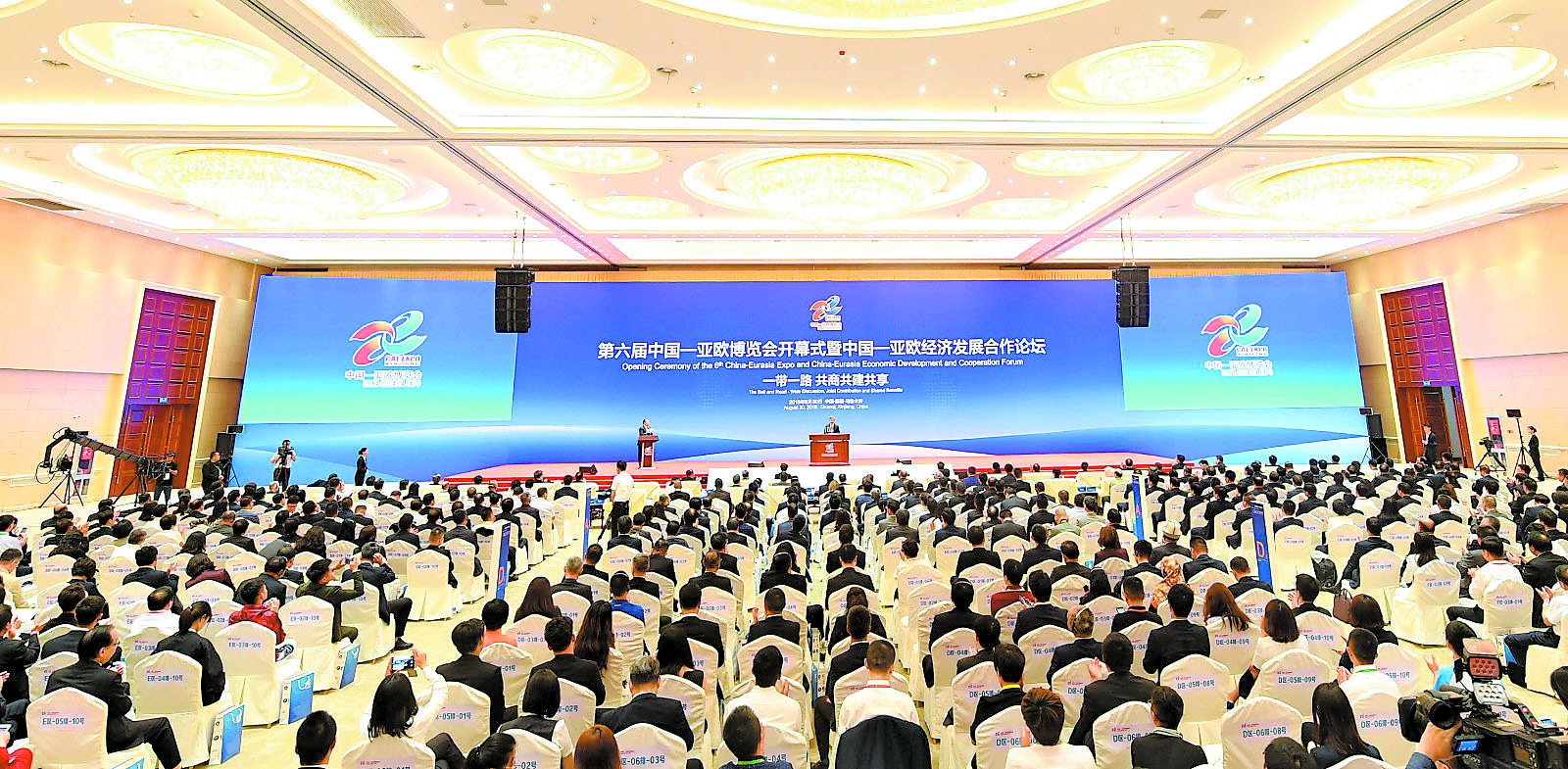 本届博览会的主题是“一带一路共商共建共享”。上午11时,第六届中国—亚欧博览会开幕式暨中国—亚欧经济发展合作论坛正式开始。新疆国际会展中心多功能厅内高朋满座,来自国内外的政要嘉宾在这里对话交流、共谋“一带一路”国际合作。