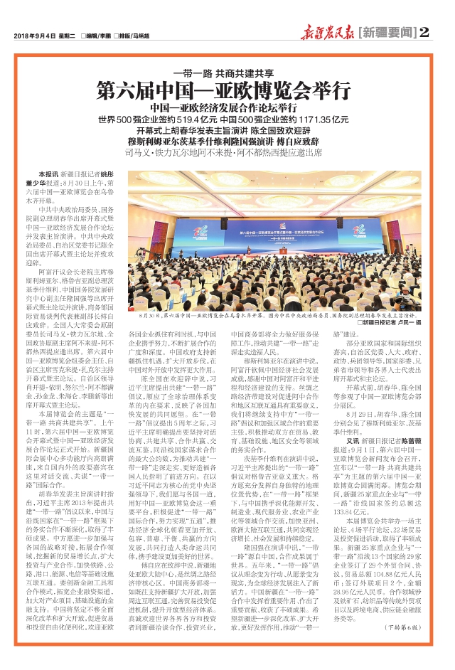 本报讯新疆日报记者姚彤董少华报道:8月30日上午,第六届中国—亚欧博览会在乌鲁木齐开幕。