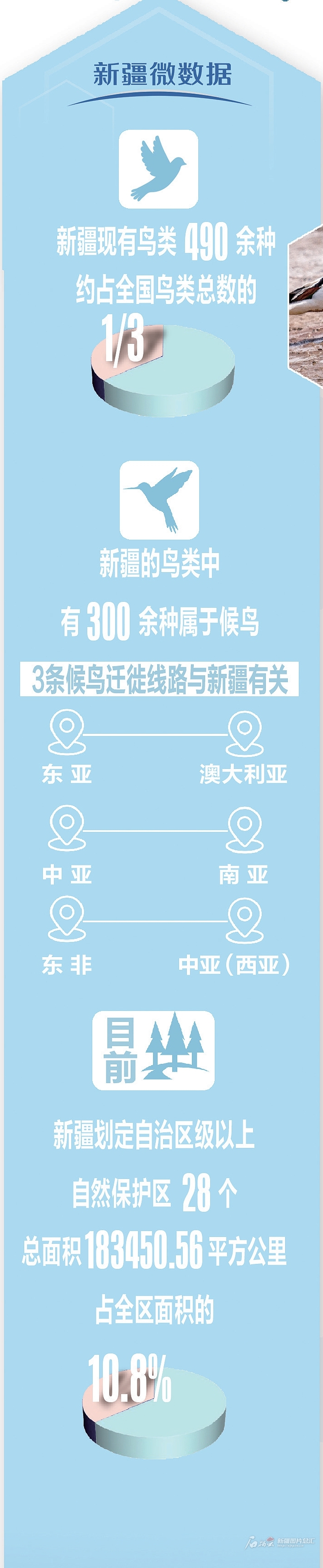 中国科学院新疆生态与地理研究所研究员、鸟类研究专家马鸣介绍,新疆地处重要鸟类繁殖地西伯利亚和鸟类越冬地南亚印度次大陆之间,是候鸟迁徙的必经之路。新疆的鸟类中有300余种属于候鸟,目前经过我国的3大候鸟迁徙通道,即东亚—澳大利亚、中亚—南亚、东非—中亚(西亚)线路均与新疆有关,其中东非—中亚(西亚)迁徙路线覆盖了大半个新疆。