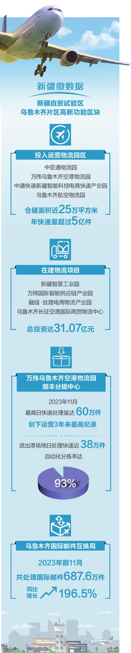 作为一家在乌鲁木齐市扎根发展的基地航空公司,中国南方航空股份有限公司新疆分公司2023年11月把一系列物流产业项目落地高新功能区块。
