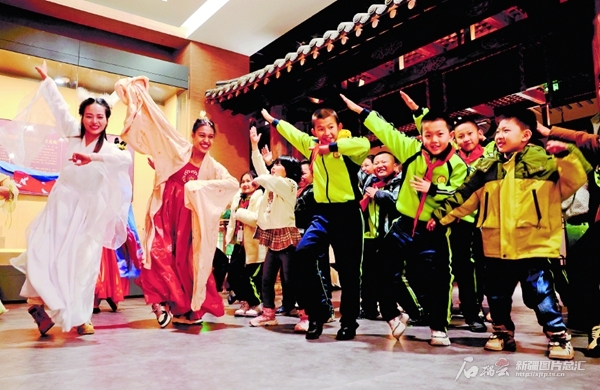 1月11日,参加研学游活动的学生在昌吉博物馆和老师一起跳“科目三”。连日来,昌吉博物馆迎来学生研学游高峰,孩子们走出课堂,在博物馆里感知历史,学习中华优秀传统文化,开阔了视野,增长了见识。 □梁宏涛摄