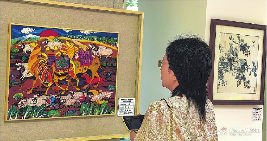 8月13日,参观者在观看展出的农民画作品。当日,“文润天山·讲好中国新疆故事——雪都阿勒泰 净土喀纳斯书画摄影作品展”在自治区人民政府参事文史馆开幕。展览期间,还将举办书画摄影作品研讨、艺术家现场创作交流等一系列丰富多彩的文化活动。 □石榴云/新疆日报记者李雄心摄