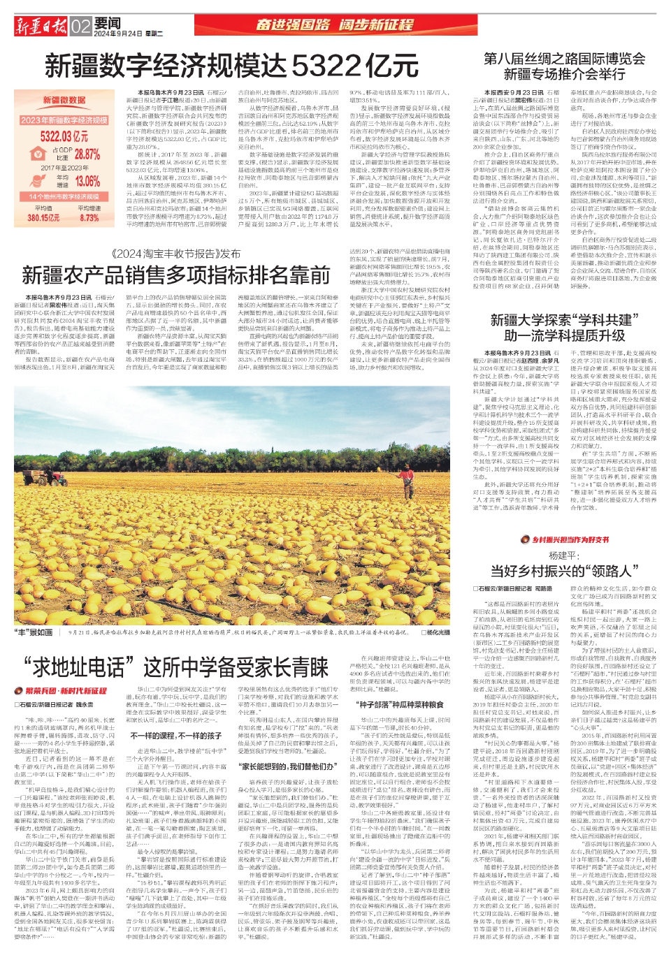 新疆数字经济规模达5322亿元 新疆农产品销售多项指标排名靠前 “丰”景如画 “求地址电话” 这所中学备受家长青睐 第八届丝绸之路国际博览会新疆专场推介会举行 新疆大学探索“学科共建”助一流学科提质升级 当好乡村振兴的“领路人”