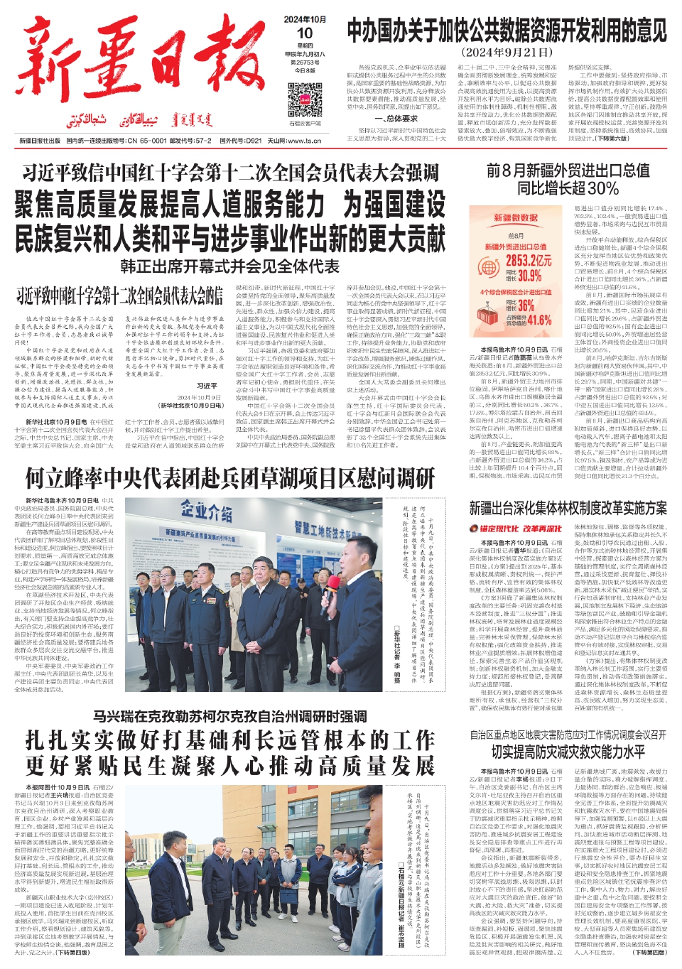 本报阿图什10月9日讯 石榴云/新疆日报记者王兴瑞报道:自治区党委书记马兴瑞10月9日来到克孜勒苏柯尔克孜自治州调研,深入考察职业教育、园区企业、乡村产业发展和基层治理工作。他强调,要把习近平总书记关于新疆工作的重要讲话重要指示批示精神落实落细落具体,聚焦完整准确全面贯彻新时代党的治疆方略,更好统筹发展和安全、开放和稳定,扎扎实实做好打基础、利长远、管根本的工作,推动经济高质量发展实现新进展,基层治理水平得到新提升,增进民生福祉取得新成效。