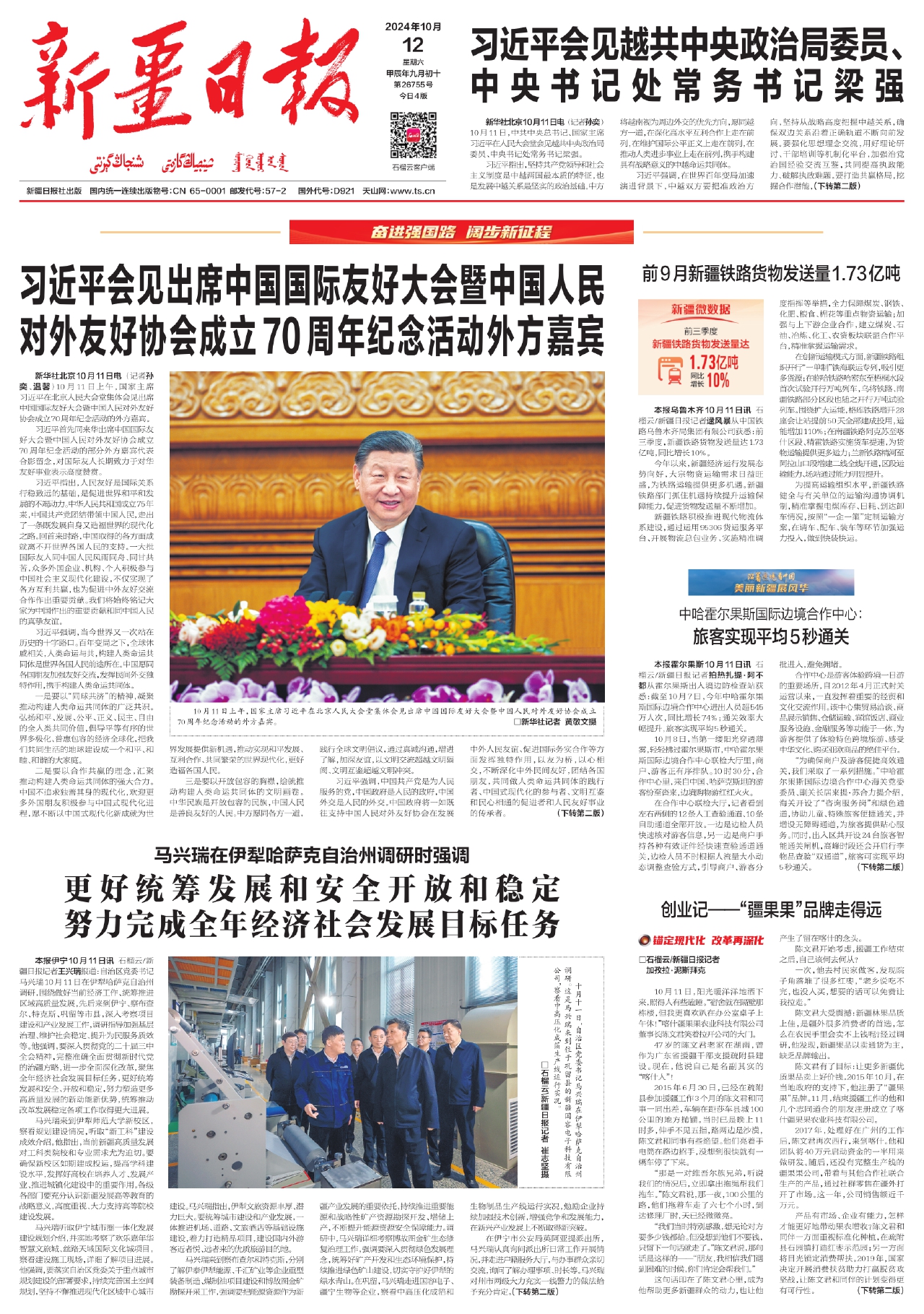 本报伊宁10月11日讯 石榴云/新疆日报记者王兴瑞报道:自治区党委书记马兴瑞10月11日在伊犁哈萨克自治州调研,围绕做好当前经济工作、统筹推进区域高质量发展,先后来到伊宁、察布查尔、特克斯、巩留等市县,深入考察项目建设和产业发展工作,调研指导加强基层治理、维护社会稳定、提升为民服务质效等。他强调,要深入贯彻党的二十届三中全会精神,完整准确全面贯彻新时代党的治疆方略,进一步全面深化改革,聚焦全年经济社会发展目标任务,更好统筹发展和安全、开放和稳定,努力塑造更多高质量发展的新动能新优势,统筹推动改革发展稳定各项工作取得更大进展。