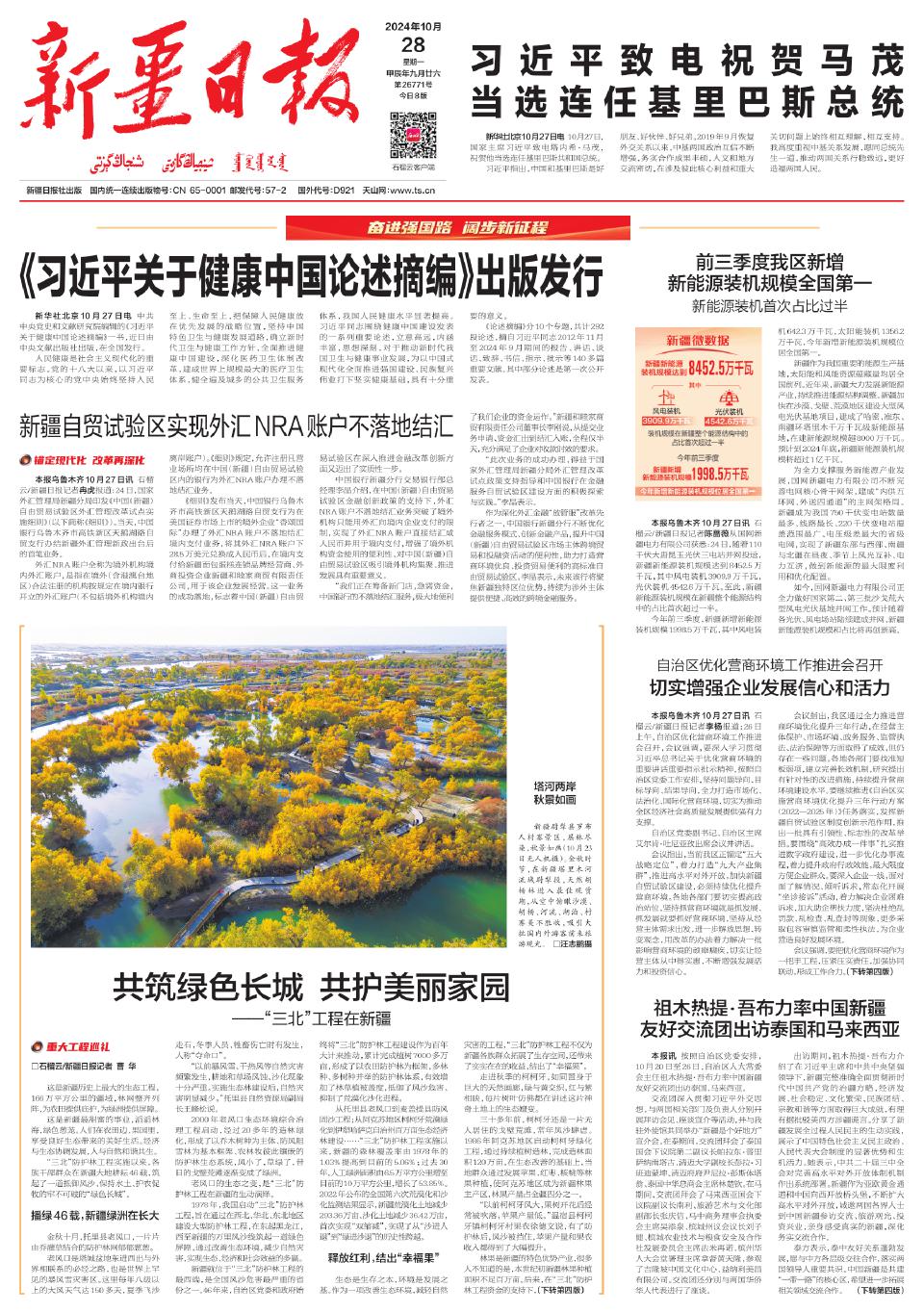 今年前三季度,新疆新增新能源装机规模1998.5万千瓦,其中风电装机642.3万千瓦,太阳能装机1356.2万千瓦,今年新增新能源装机规模位居全国第一。