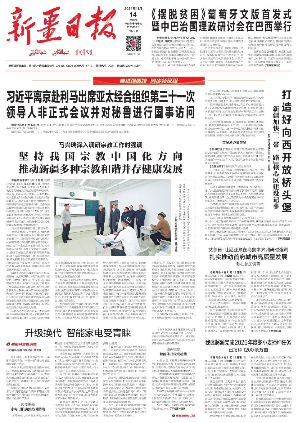 本报乌鲁木齐11月13日讯 石榴云/新疆日报记者王兴瑞报道:自治区党委书记马兴瑞11月13日深入伊斯兰教经学院和有关宗教活动场所等地调研。他强调,要深入学习贯彻习近平总书记关于宗教工作的重要论述,深刻认识做好宗教工作在推进新疆工作中的重要性,全面贯彻党的宗教工作基本方针,坚持我国宗教中国化方向,紧扣铸牢中华民族共同体意识主线,着力建强“三支队伍”,提升宗教事务治理法治化水平,积极引导宗教与社会主义社会相适应,推动多种宗教和谐并存、健康发展,在推进中国式现代化新疆实践中更好发挥积极作用。