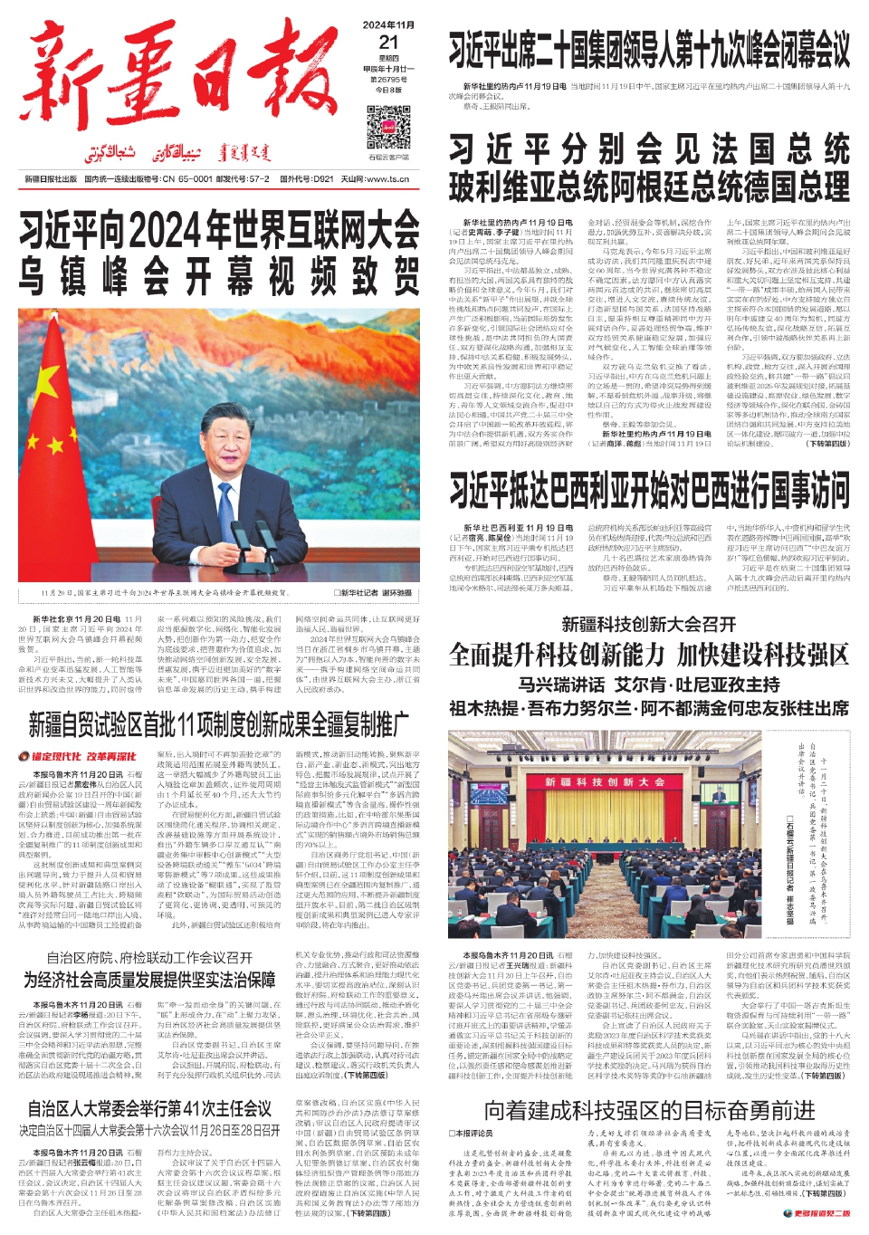 本报乌鲁木齐11月20日讯 石榴云/新疆日报记者王兴瑞报道:新疆科技创新大会11月20日上午召开,自治区党委书记、兵团党委第一书记、第一政委马兴瑞出席会议并讲话。他强调,要深入学习贯彻党的二十届三中全会精神和习近平总书记在省部级专题研讨班开班式上的重要讲话精神,学懂弄通做实习近平总书记关于科技创新的重要论述,深刻把握科技强国建设目标任务,锚定新疆在国家全局中的战略定位,以强烈责任感和使命感谋划推进新疆科技创新工作,全面提升科技创新能力,加快建设科技强区。