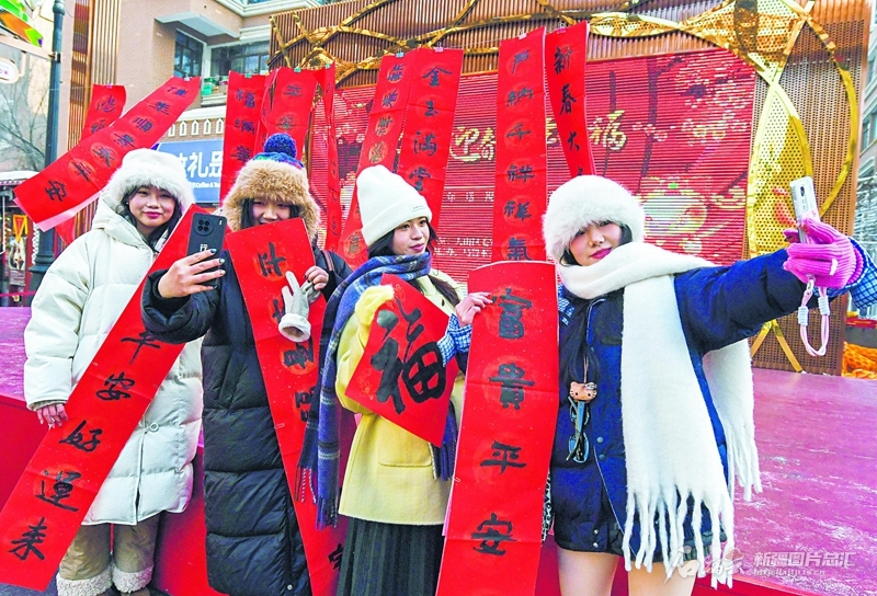 1月14日,乌鲁木齐大巴扎步行街,来自江西的游客拿着春联打卡拍照。当日,乌鲁木齐市天山区举行“金蛇迎春 新年送福”公益惠民活动,邀请多位书法家现场为市民和游客写春联,送上新春祝福。 □石榴云/新疆日报记者汤永摄