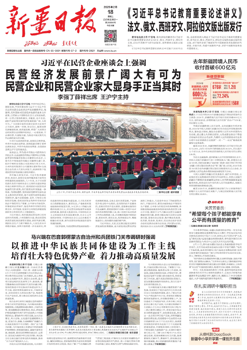 马兴瑞强调,新疆推进中国式现代化建设,必须牢牢把握铸牢中华民族共同体意识这条主线,坚持高质量发展这个硬道理,通过发展促进稳定、巩固团结、造福人民,让发展面貌不断焕新、各族群众更加富裕。要始终把维护社会稳定摆在首位,统筹防范化解各领域重大风险隐患,坚决维护国家政治安全和新疆社会稳定。要深入推进文化润疆,加强文物保护利用和文化遗产保护传承,全方位促进各族群众交往交流交融,推动各项工作更加有形有感有效。要坚持把发展特色优势产业作为主攻方向,紧紧依托能源资源优势建设“十大产业集群”,推动传统产业提质增效,培育壮大战略性新兴产业。要持续推动各类园区和开发区高质量发展,加快标志性、战略性、引领性重大产业项目建设,为推动高质量发展提供强劲推动力支撑力。要促进各种所有制经济优势互补、共同发展,切实提高国有企业核心竞争力,落实促进民营经济发展的各项政策措施,营造各类企业竞相发展的良好环境。要以更大力度加快兵地融合,全面推进兵地经济、社会、文化、生态文明建设和民族团结进步、干部人才等深度融合发展取得更多突破。