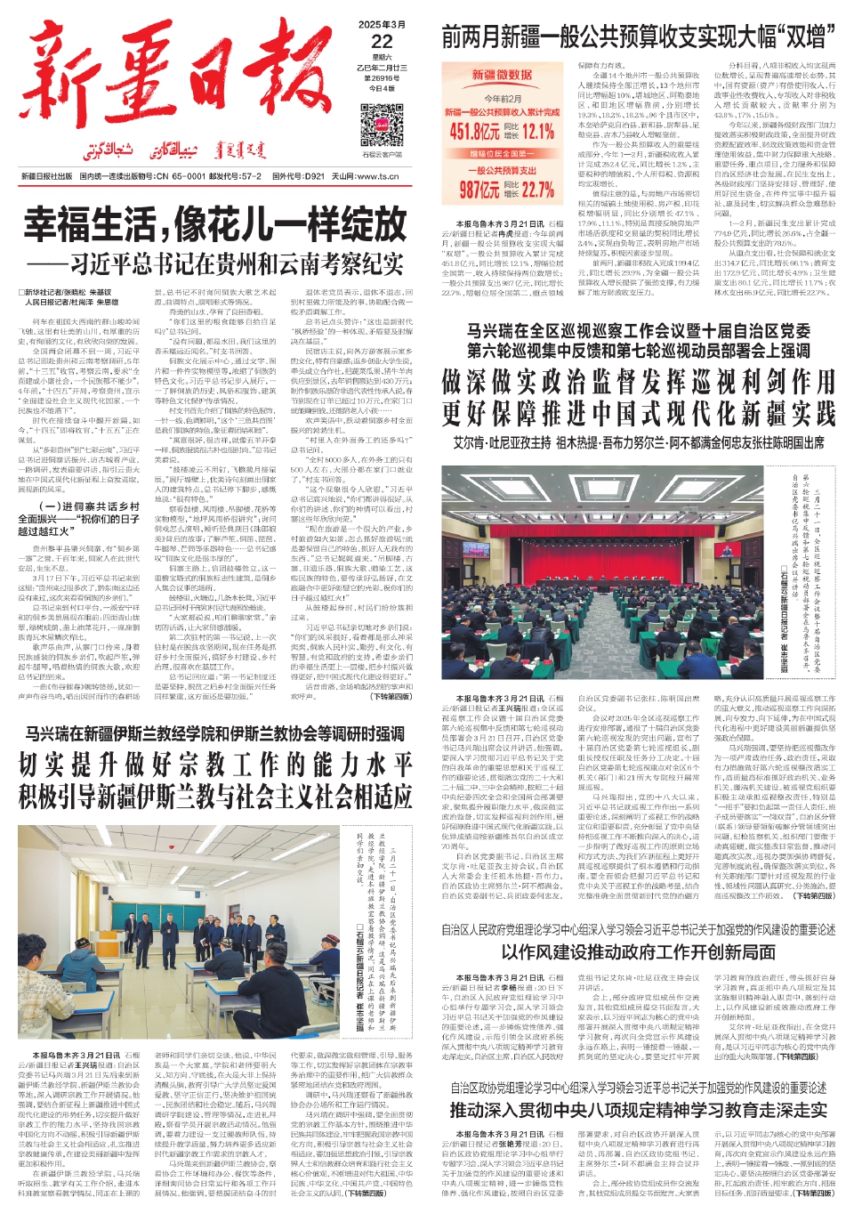 本报乌鲁木齐3月21日讯 石榴云/新疆日报记者王兴瑞报道:自治区党委书记马兴瑞3月21日先后来到新疆伊斯兰教经学院、新疆伊斯兰教协会等地,深入调研宗教工作开展情况。他强调,要结合新征程上新疆推进中国式现代化建设的形势任务,切实提升做好宗教工作的能力水平,坚持我国宗教中国化方向不动摇,积极引导新疆伊斯兰教与社会主义社会相适应,扎实推进宗教健康传承,在建设美丽新疆中发挥更加积极作用。
