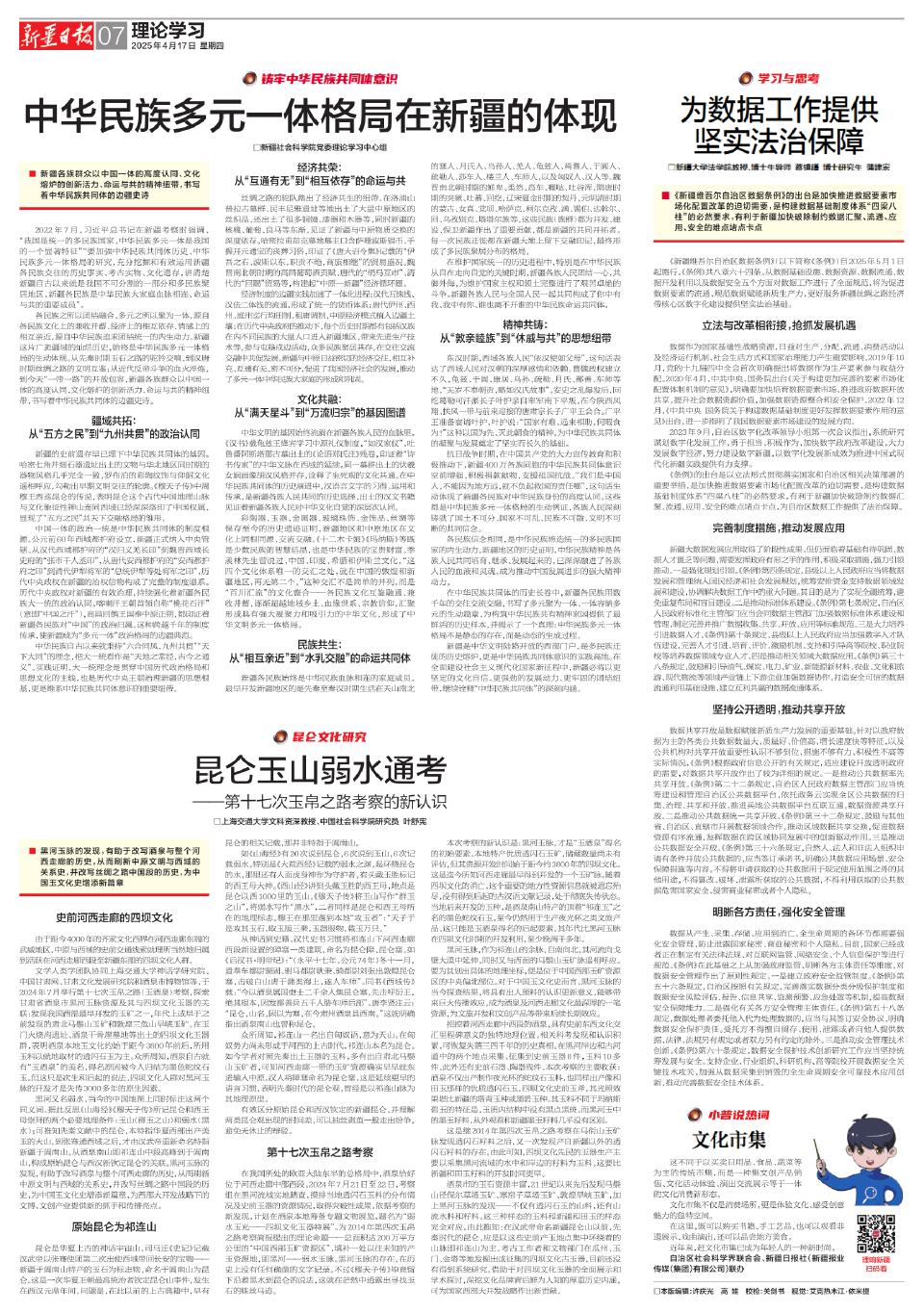 各民族之所以团结融合,多元之所以聚为一体,源自各民族文化上的兼收并蓄、经济上的相互依存、情感上的相互亲近,源自中华民族追求团结统一的内生动力。新疆这片广袤疆域的灿烂历史,始终是中华民族多元一体格局的生动体现。从先秦时期玉石之路的驼铃交响,到汉唐时期丝绸之路的文明互鉴;从近代反帝斗争的血火淬炼,到今天“一带一路”的开放包容,新疆各族群众以中国一体的高度认同、文化熔炉的创新活力、命运与共的精神纽带,书写着中华民族共同体的边疆史诗。