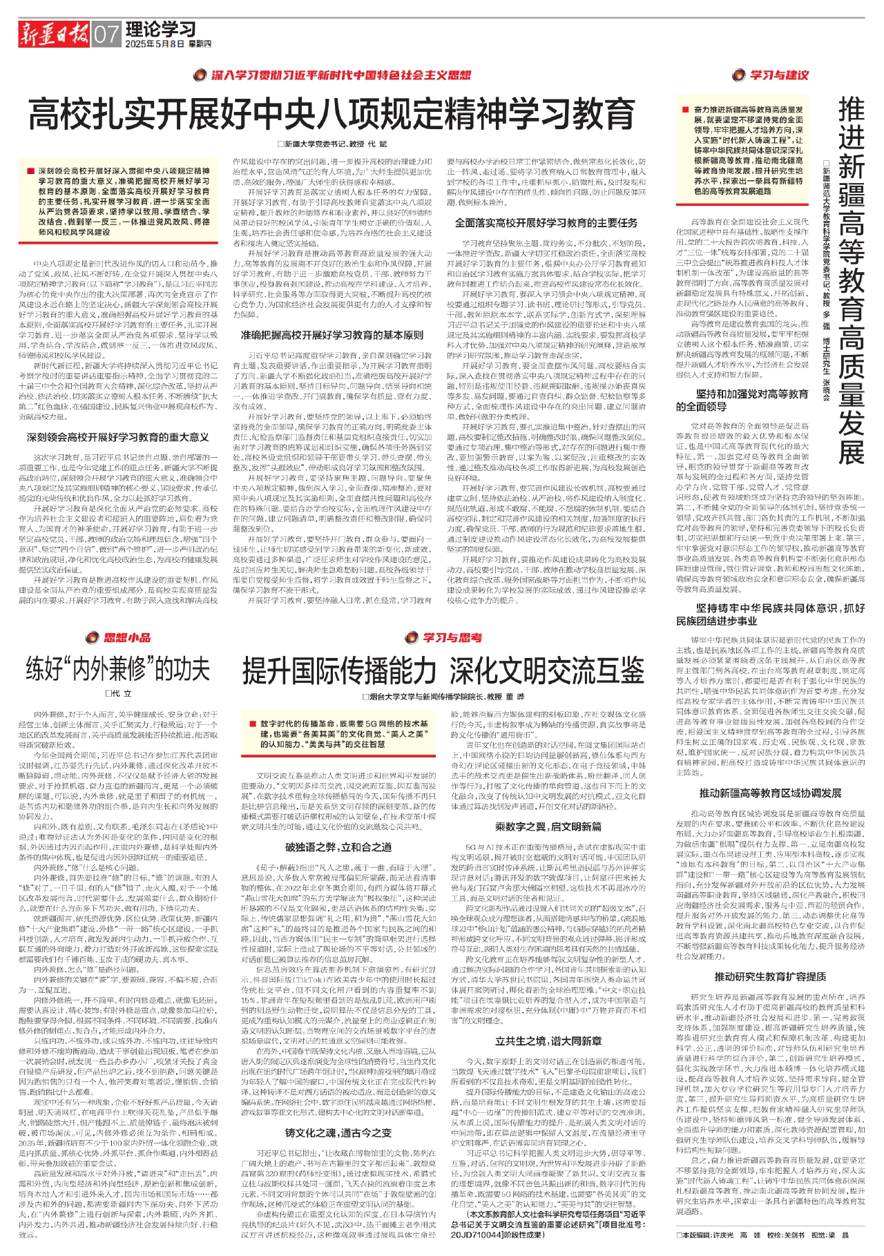 ■奋力推进新疆高等教育高质量发展,就要坚定不移坚持党的全面领导,牢牢把握人才培养方向,深入实施“时代新人铸魂工程”,让铸牢中华民族共同体意识深深扎根新疆高等教育,推动南北疆高等教育协同发展,提升研究生培养水平,探索出一条具有新疆特色的高等教育发展道路