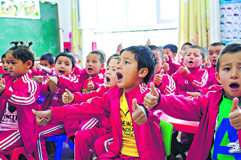 西北油田援建柯坪县盖孜力克镇阳光幼儿园,解决了当地300名儿童入园难题。图为孩子们在幼儿园认真学习(2017年8月9日摄)。 □李学仁摄