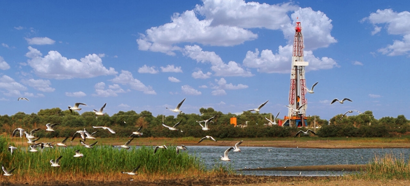 西北油田严守生态红线,将低碳环保贯穿油气生产全过程。图为在库车市塔里木镇一座钻井平台附近的巴依孜湖面上,一群红嘴鸥在嬉戏(2019年8月18日摄)。 □胡强摄