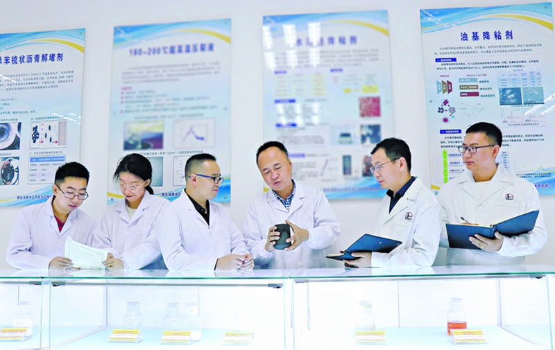西北油田提高采收率工程高级专家、全国五一劳动奖章获得者何龙(右三),带领其创新工作室成员,在实验室开展药剂攻关(2024年5月10日摄)。 □李敏越摄