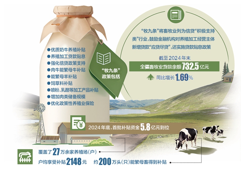 “牧九条”政策主要包括优质奶牛养殖补贴,养殖加工贷款贴息,强化信贷政策支持,肉牛能繁母牛补贴,能繁母羊补贴,饲草料补贴,喷粉、乳酪等加工产品补贴,增加肉类储备规模和优化政策性养殖业保险九个方面。去年底,首批补贴资金5.8亿元到位后,覆盖了27万余家养殖场(户),户均享受补贴2148元,约200万头(只)能繁母畜得到补贴。