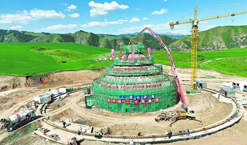 6月8日,在奇台县半截沟镇石河子村,随着110米口径全向可动射电望远镜中心塔最后一方混凝土浇筑完成,由中铁二十局承建的世界最大、精度最高的全向可动射电望远镜项目土建主体工程封顶。 □张琪摄
