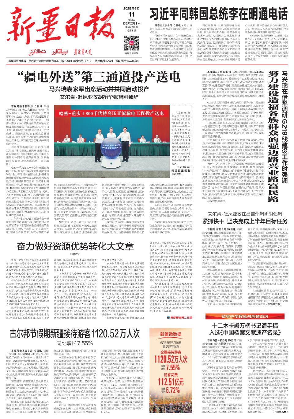 本报玛纳斯6月10日讯 石榴云/新疆日报记者李杨报道:6月8日,自治区党委副书记、自治区主席艾尔肯·吐尼亚孜来到昌吉回族自治州玛纳斯县,调研“三农”工作、乡村振兴、工业经济、兵地融合等。他强调,要完整准确全面贯彻新发展理念和新时代党的治疆方略,按照自治区党委要求,更好统筹发展和安全、开放和安全,进一步解放思想、紧抓快干,坚决完成上半年目标任务,为全区发展大局多作贡献。
