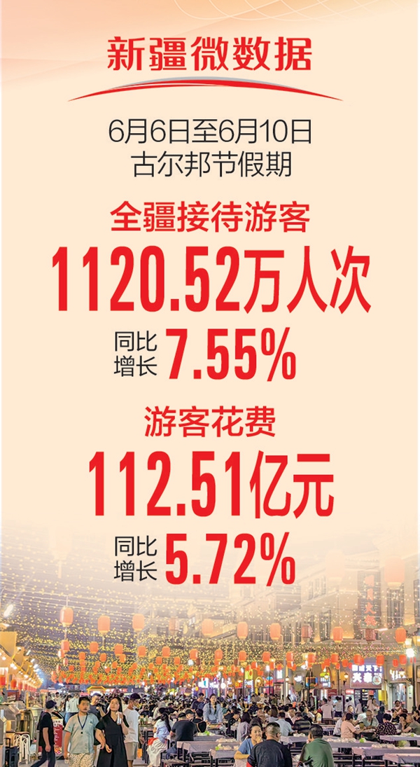 本报乌鲁木齐6月10日讯 石榴云/新疆日报记者姚刚从自治区文化和旅游厅获悉:6月6日—10日古尔邦节假期,全疆共接待游客1120.52万人次,同比增长7.55%;游客花费112.51亿元,同比增长5.72%。各地通过深挖传统文化内涵、创新消费场景、拓展旅游业态,全力推动节日期间文化和旅游消费提质升级。