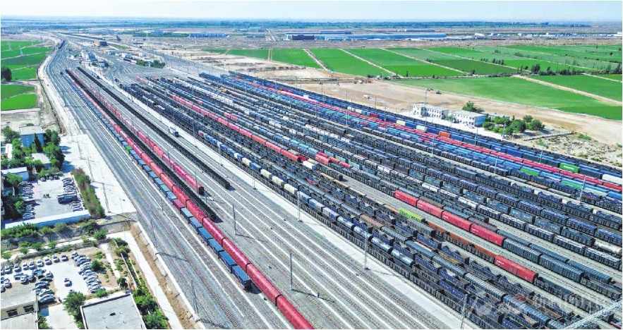 哈密东站整装待发的货运班列(6月13日无人机摄)。哈密东站是重要交通枢纽,承担着进出疆货物列车的编组等任务,5月启动扩能改造工程,改造后将大幅提升列车周转率,增强兰新铁路综合效能。 □石榴云/新疆日报记者蔡增乐摄