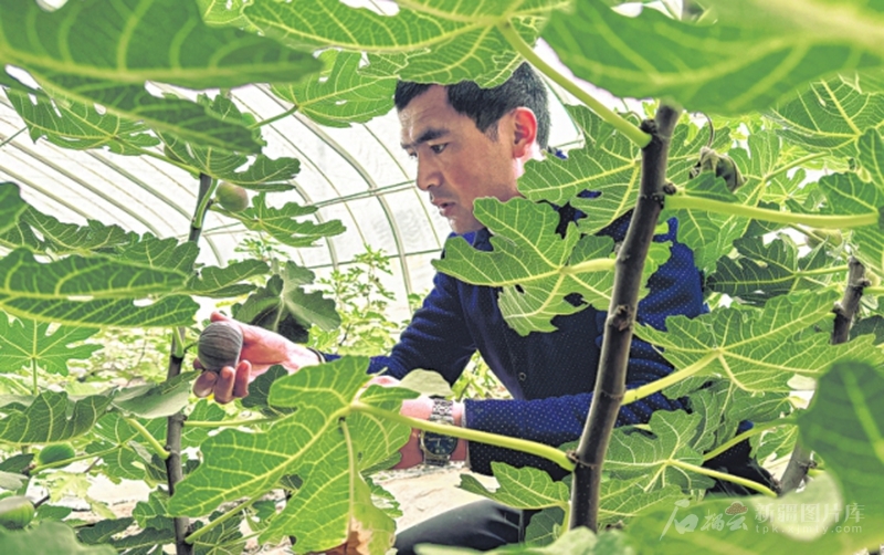 6月22日,阿图什市上阿图什镇一位无花果种植户在查看无花果长势。□高萌摄