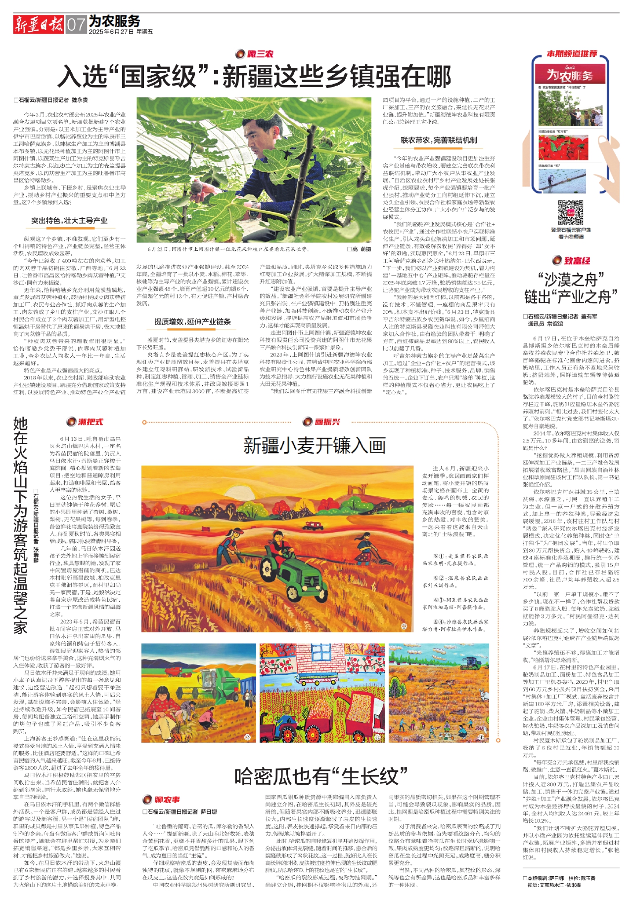 今年3月,农业农村部公布2025年农业产业融合发展项目立项名单,新疆获批新建7个农业产业强镇。分别是:以玉米加工业为主导产业的伊宁市巴彦岱镇、以骆驼养殖业为主的阜康市三工河哈萨克族乡、以辣椒生产加工为主的博湖县本布图镇、以无花果种植加工为主的阿图什市上阿图什镇、以蔬菜生产加工为主的特克斯县呼吉尔特蒙古族乡、以红枣生产加工为主的麦盖提县央塔克乡、以肉苁蓉生产加工为主的吐鲁番市高昌区恰特喀勒乡。