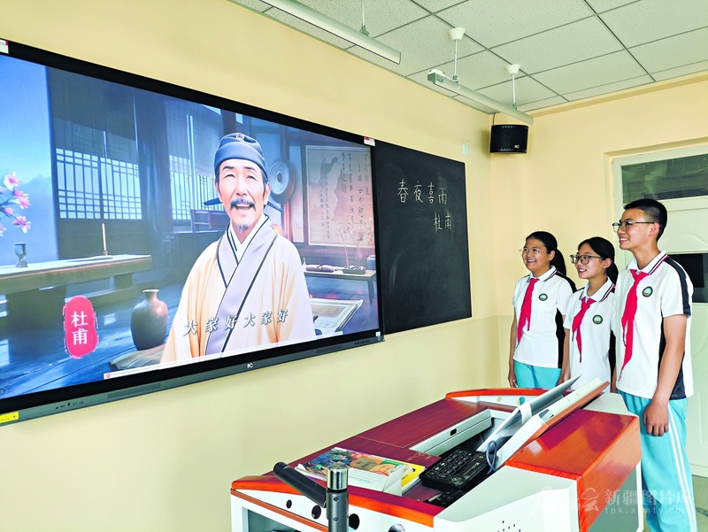 AI如何帮助学生读懂古诗词?6月24日,在阿勒泰市中心小学六年级(1)班语文课上,语文教师方改霞运用AI技术,将古诗《春夜喜雨》的作者杜甫“请”进课堂,带领学生们穿越时空,领略诗人笔下千年前的景象。