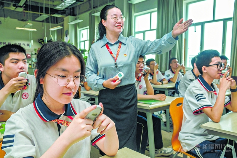 7月2日,克拉玛依市第一中学学生用AI语音答题器答题。□闵勇摄