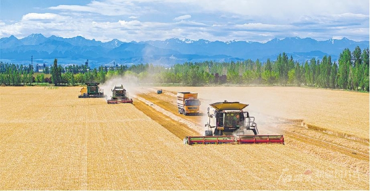 目前,奇台县66万亩小麦进入成熟期,全县700台联合收割机全部驶入麦田开展收割作业。□何龙摄