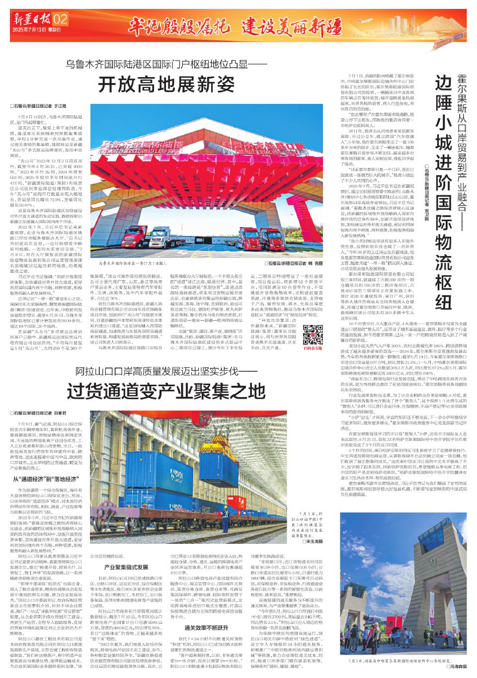 7月9日,暑气正盛。阿拉山口综合保税区内车辆穿梭如织,装卸机高效作业,集装箱起落间,货物被精准送到指定区域。不远处的跨境电商产业园仓库里,工人正分拣着堆积如山的货物。当日,一批批经海关放行的货车有序驶向中亚、欧洲等地。这座连接着中国与中亚、欧洲的口岸城市,正从单纯的过货通道,蜕变为产业聚集的热土。