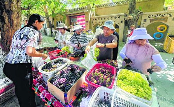 7月9日,吐鲁番市葡萄沟景区,游客在购买鲜食葡萄。 □阿地兰摄