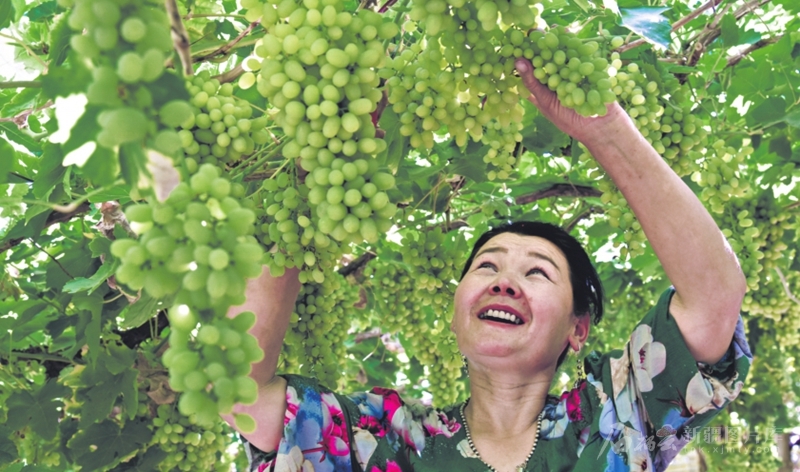 吐鲁番市高昌区三堡乡英吐尔村果农在采摘成熟的葡萄(7月7日摄)。眼下,吐鲁番市63万亩葡萄陆续成熟,果农忙着采摘、装箱,销往北京、广州、西安等地。 □刘健摄