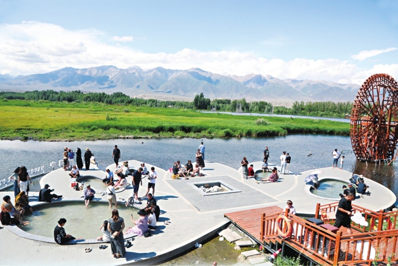 在温泉县博尔塔拉河国家湿地公园花海区域,沿着拓宽后的湿地木栈道前行,“百米温廊”映入眼帘,6个嵌入栈道的观景温泉泡脚池整齐排列,可同时容纳150人,有效补齐了县城内“雪莲花”泡脚池承载能力有限的短板。县城内还有以“水天结合、展翅翱翔”为设计理念打造的“温泉之翼”,深入湿地,周边芦苇环绕,7个沉浸式秘境温泉池隐匿其中,为游客带来别具一格的体验。
